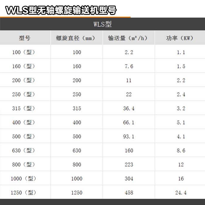 型號(hào):LS型螺旋輸送機(jī)以管徑為型號(hào):100mm,200mm,250mm,315mm,400mm,500mm,600mm等型號(hào)。