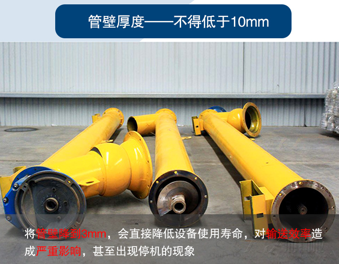 一般情況下,管式螺旋輸送機管壁厚度要求不低于10mm,有些廠家為了在其中賺取更多利益,將管壁降到了3mm,會直接降低設(shè)備使用壽命,對輸送效率造成嚴重影響,甚至出現(xiàn)停機的現(xiàn)象。