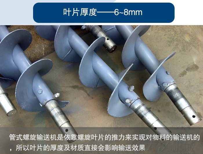 管式螺旋輸送機是依靠螺旋葉片的推力來實現(xiàn)對物料的輸送機的,所以葉片的厚度及材質(zhì)直接會影響輸送效果,葉片厚度一般在6~8mm左右,也可以根據(jù)物料的耐磨程度來加厚,這些直接與設(shè)備的使用壽命掛鉤的,所以用戶在選型時要特別注意這一點。