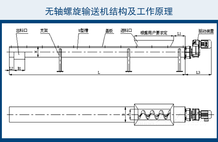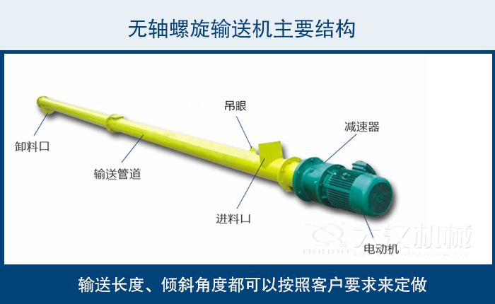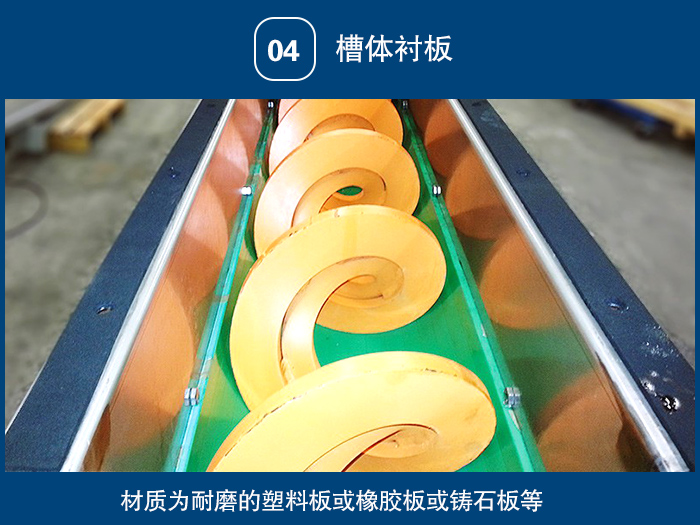 驅動、殼體、襯板、葉片、 支架、蓋板、進料口、出料口,輸送長度、傾斜角度都可以按照客戶要求來定做,不同物料不同輸送角度我們?yōu)槟侠磉x型!