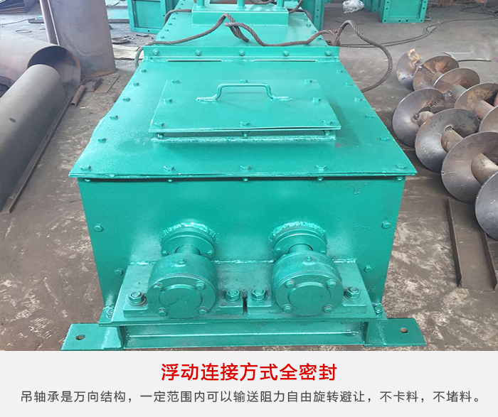 各傳動(dòng)部位都是采用浮動(dòng)連接方式,吊軸承是萬向結(jié)構(gòu),使吊軸承、螺旋體和尾部總能形成一個(gè)整體的旋浮體,在一定范圍內(nèi)可以輸送阻力自由旋轉(zhuǎn)避讓,不卡料,不堵料。