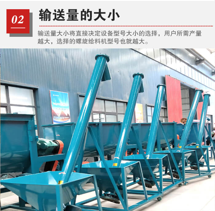 輸送量大小將直接決定設(shè)備型號大小的選擇,用戶所需產(chǎn)量越大,選擇的螺旋給料機型號也就越大,用戶需要結(jié)合自身對產(chǎn)量的需求來選擇合適的型號。