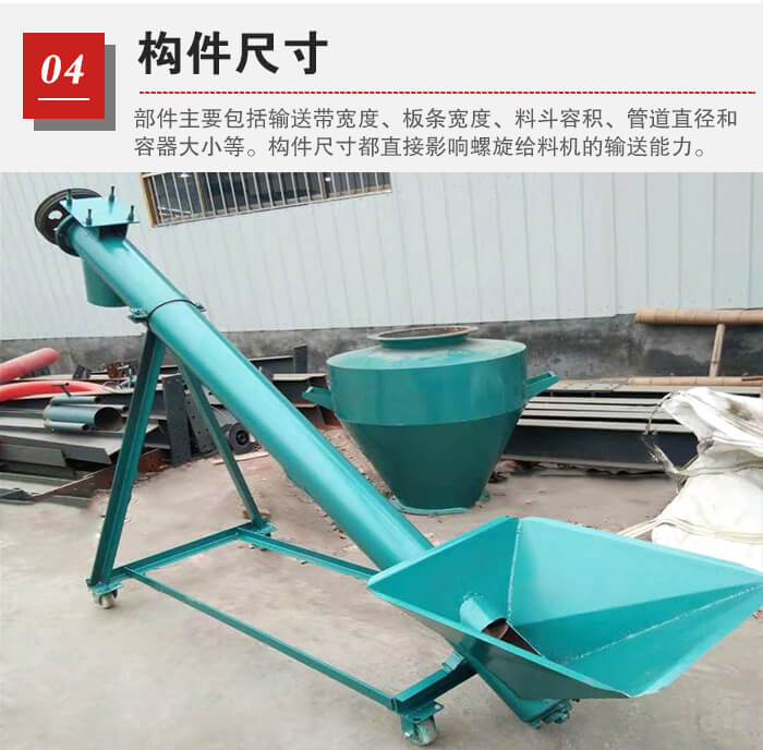 主要包括輸送帶寬度、板條寬度、料斗容積、管道直徑和容器大小等。這些構(gòu)件尺寸都直接影響螺旋給料機的輸送能力。如螺旋輸送機管徑越大,效率也就越高。當然,并不一定就是輸送機本身才能影響效率,物料的各種性質(zhì)也都會對效率有所影響。