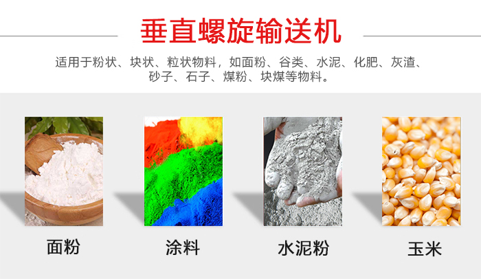 垂直螺旋輸送機適用于粉狀、塊狀、粒狀物料,如面粉、谷類、水泥、化肥、灰渣、砂子、石子、煤粉、塊煤等物料。同時還可用于建材、冶金、化工、采掘、機械制造、煤灰、糧食、食品、等行業(yè)。