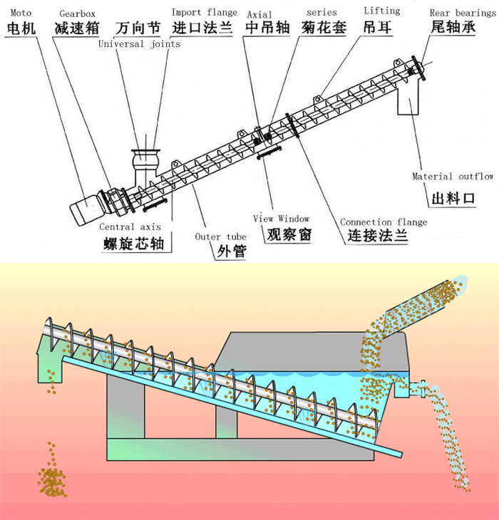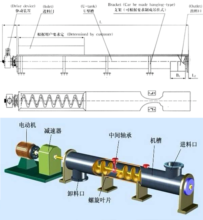 水平螺旋輸送機是將物料均勻地喂送到下道工序中,在驅(qū)動裝置中電動機帶動減速機,再由聯(lián)軸器傳遞給螺旋軸當(dāng)物料從進料口進去后,在螺旋葉片的作用下將物料均勻輸出。