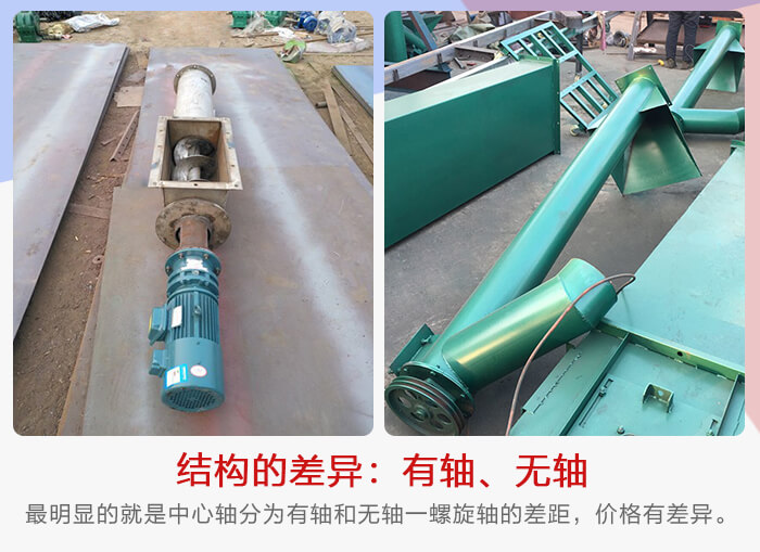 移動(dòng)式螺旋輸送機(jī)在結(jié)構(gòu)特點(diǎn)上其是有所差距的。其中最明顯的就是中心軸分為有軸和無軸,雖然他們就只有一螺旋軸的差距,但是價(jià)格還是有幾百甚至上千元的差異,具體差異要以型號(hào)差異為主。