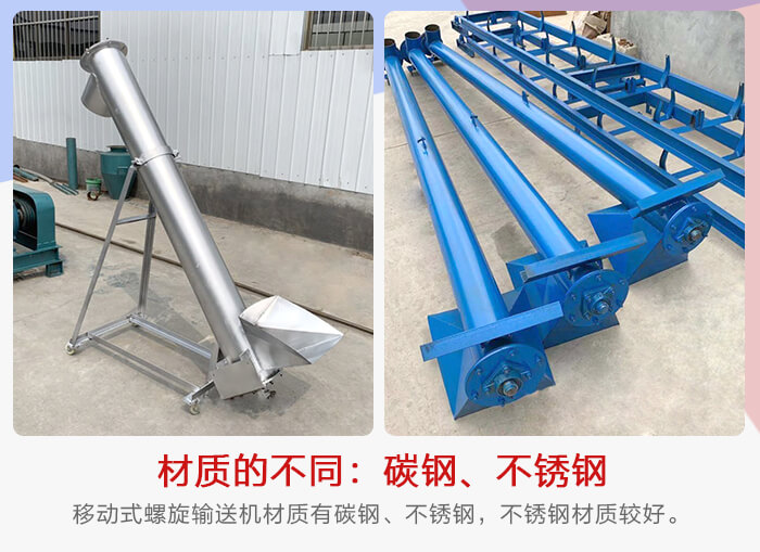移動(dòng)式螺旋輸送機(jī)材質(zhì)有碳鋼、不銹鋼,不銹鋼材質(zhì)的價(jià)格要貴1倍左右,不銹鋼的主要用于對(duì)輸送環(huán)境要求高的行業(yè),清潔度高,不會(huì)污染物料,使用時(shí)間長,造價(jià)也相對(duì)高。碳鋼材質(zhì)可以主要應(yīng)用在一些對(duì)物料要求不是很嚴(yán)格或?qū)Γ菪斔蜋C(jī)的衛(wèi)生沒什么特別要求的地方,例如:一些煤炭,石灰,石子等一些顆粒狀的行業(yè)。