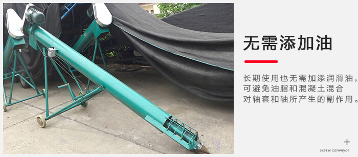 由于移動式螺旋輸送機采用了新穎的中間軸承材料,,既能減摩,耐磨又能自潤滑,即使長期使用也毋需加添潤滑油,可避免油脂和混凝土混合對軸套和軸所產(chǎn)生的副作用。