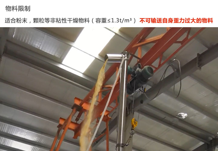 垂直螺旋輸送機只用于輸送粉末或固體顆粒等非粘性干燥物料(容重≤1.3t/m³),因為其采用向上輸送,在輸送過程中物料自身重力如果過重,會造成輸送難以進行。