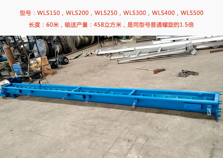 無軸螺旋輸送機常規(guī)型號有WLS150,WLS200,WLS250,WLS300,WLS400,WLS500等6種規(guī)格可選,單機長度60米,輸送產(chǎn)量高達458立方米,是同型號普通螺旋的1.5倍;可輸送帶狀、黏稠物料、易纏繞物料;具體參數(shù)如下: