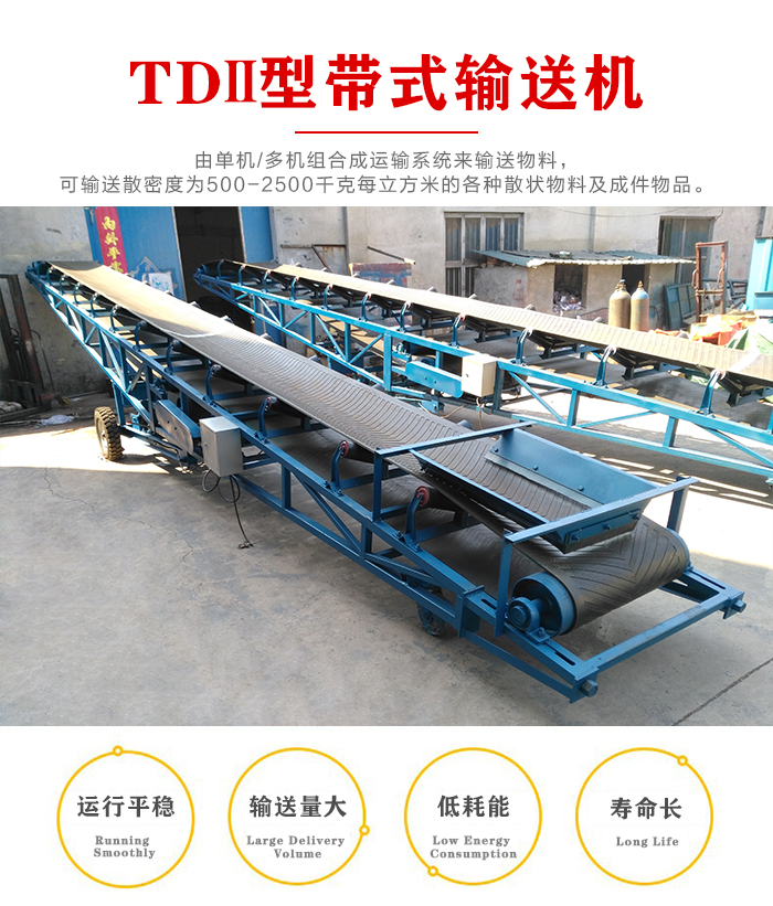 TDII型帶式輸送機式通過型系列產(chǎn)品,是將原來TD75型機、DX型兩大系列(即通用型和高強度型)統(tǒng)一,更新?lián)Q代的新產(chǎn)品,可廣泛用于冶金、礦山、煤炭、港口、電站、建材、化工、輕工、石油等各個行業(yè)。由單機多機組合成運輸系統(tǒng)來輸送物料,可輸送散密度為500-2500KG/M3的各種散狀物料及成件物品。