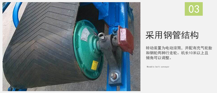 采用鋼管結(jié)構(gòu),輕巧美觀,機(jī)動性好。轉(zhuǎn)動裝置為電動滾筒,并配有充氣輪胎和鋼輪兩種行走輪。機(jī)長10米以上且傾角可以調(diào)整。