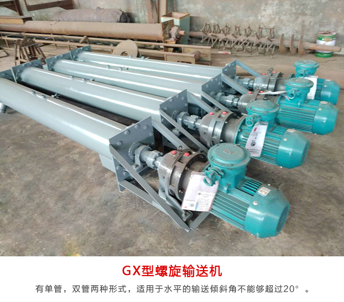 GX型螺旋輸送機有單管,雙管兩種形式,適用于水平的輸送傾斜角不能夠超過20°??奢斔鸵恍K狀的(小塊狀物料)例如:麥子,玉米,黃豆等糧食。