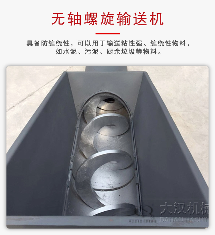 無軸螺旋輸送機采用了無中心軸設(shè)計,具備防纏繞性,可以用于輸送粘性強、纏繞性物料,如水泥、污泥、廚余垃圾等物料,可水平、傾斜輸送(傾斜角度不超過20°),大漢無軸螺旋輸送機可分為單無軸和雙無軸螺旋輸送機,還可根據(jù)輸送物料及應(yīng)用場合分為碳鋼、不銹鋼材質(zhì)。