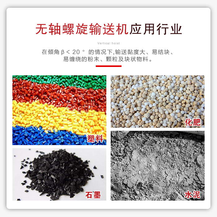 無軸螺旋輸送機廣泛用于食品、醫(yī)藥、化工、 建筑等部門,在傾角β< 20 °的情況下,輸送黏度大、易結(jié)塊、易纏繞的粉末、顆粒及塊狀物料。