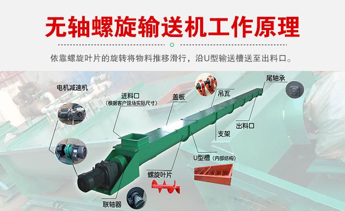 無軸螺旋輸送機由驅(qū)動機構(gòu)(電機減速機、傳動軸)、U型槽與支架、無軸螺旋、襯條、蓋板、進料口、出料口、緊固件等部件組成。當物料從輸送機的進料口進入,依靠螺旋葉片的旋轉(zhuǎn)將物料推移滑行,沿U型輸送槽送至出料口,并與壓榨機或垃圾小車配套,將物料進行下一步處理。