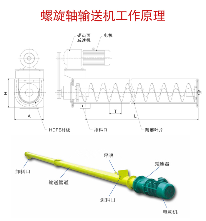 螺旋軸輸送機(jī)主要由驅(qū)動(dòng)裝置,機(jī)殼、蓋板、螺旋軸、螺旋葉片、進(jìn)料口、出料口等部件組成。