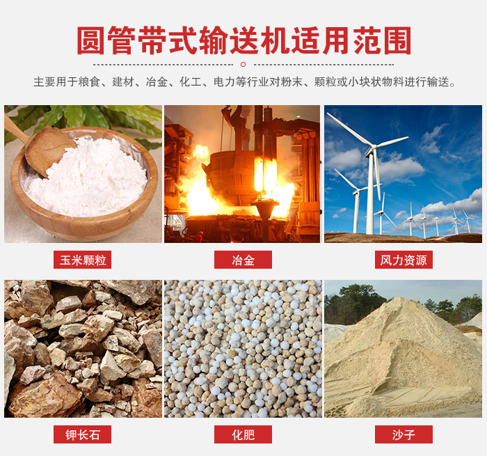 圓管帶式輸送機(jī)主要用于糧食、建材、冶金、化工、電力等行業(yè)對(duì)粉末、顆?;蛐K狀物料進(jìn)行輸送任務(wù),如水泥、混凝土、飼料、化肥、粉煤灰等物料,不宜輸送易變質(zhì)的、粘性大的、塊度大的及易結(jié)塊的物料。