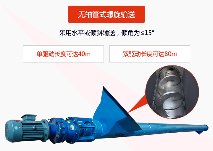 無軸?管式螺旋輸送機(jī)也叫管式無軸螺旋輸送機(jī),其外形為圓管式,可水平或傾斜輸送,其傾角為≤15°,有雙驅(qū)動和單驅(qū)動之分,單驅(qū)動螺旋機(jī)長度可達(dá)40m,雙驅(qū)動螺旋機(jī)采用中間斷開軸結(jié)構(gòu),長度可達(dá)80m。由于采用了無軸設(shè)計(jì),可輸送粘性強(qiáng)、易纏繞的物料,物料不易堵塞,排料口不堵塞。