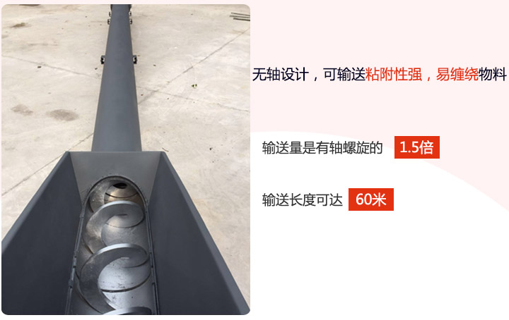 2、輸送量是相同直徑傳統(tǒng)有軸螺旋輸送機(jī)的1.5倍,單機(jī)輸送長度可達(dá)60米。