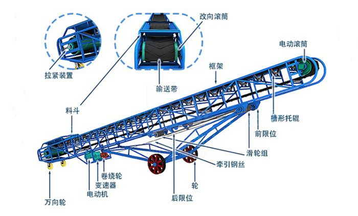 帶式輸送機(jī)主要由輸送帶、驅(qū)動(dòng)裝置、滾筒、托輥、張緊裝置、清掃裝置等組成。輸送帶是輸送機(jī)的主體部件,用于承載物料并傳遞動(dòng)力。驅(qū)動(dòng)裝置通常包括電動(dòng)機(jī)、減速器和聯(lián)軸器,提供動(dòng)力驅(qū)動(dòng)輸送帶運(yùn)行。滾筒用于支撐和傳遞輸送帶的運(yùn)動(dòng)力,托輥支撐輸送帶并減少摩擦。張緊裝置用于調(diào)整輸送帶的張緊度,保持適當(dāng)?shù)膹埩?。清掃裝置用于清除輸送帶上的雜物,保持輸送帶清潔。這些組成部分協(xié)同工作,使帶式輸送機(jī)能夠高效、穩(wěn)定地完成物料的輸送任務(wù)。